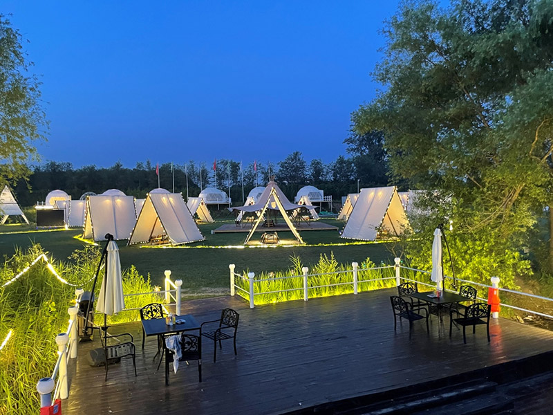 此區(qū)塊位于規(guī)劃地塊的東北角濱水區(qū)塊,該區(qū)塊項目設計意在配合度假酒店,加載精品化的休閑度假項目,打造精品度假體驗。其主要內(nèi)設項目包括垂釣俱樂部、房車營地、篝火廣場、精品帳篷酒店、帳篷餐廳和露天燒烤園等等